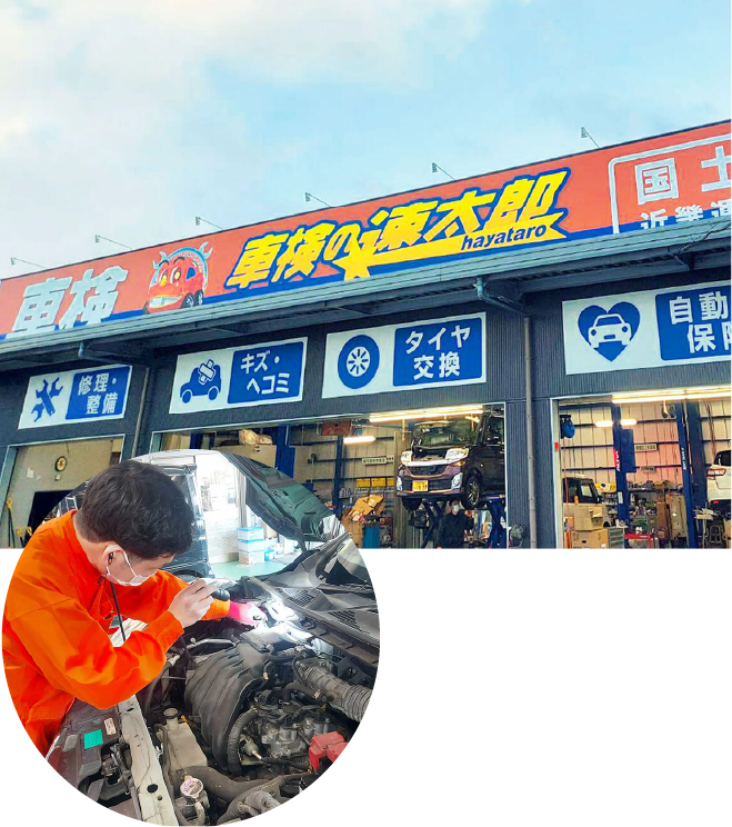 車検の速太郎イオンタウン湖南店を併設。カーディーラーと変わらない最新設備を完備している車検専門工場です。地域No.1最安値をはじめ、最短45分のスピード車検年間4,400台の車検実績と、「安い!速い!安心!の車検」でお客様のカーライフを強くサポートさせて頂きます。お車を購入して下さったお客様や、他店で購入されたお車も修理・点検・車検・鈑金・万が一の事故など、お気軽にご連絡ください。