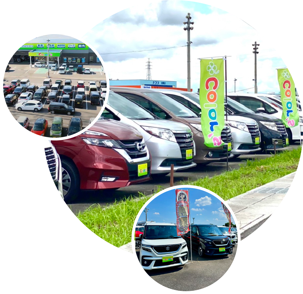 カラーズイオンタウン湖南店の魅力は滋賀県最大級の在庫量です!敷地面積約2500坪の展示場に新車・未使用車から中古車まで常時300台以上を展示。豊富な展示車の中からあなたにピッタリの1台を見つけて頂けます。